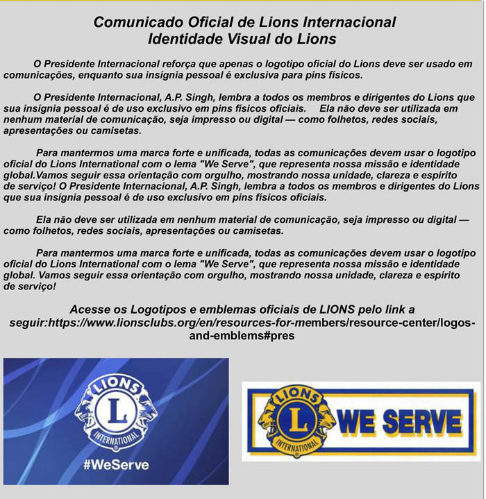 A única imagem aprovada para materiais é o logotipo oficial do Lions "Nós Servimos".