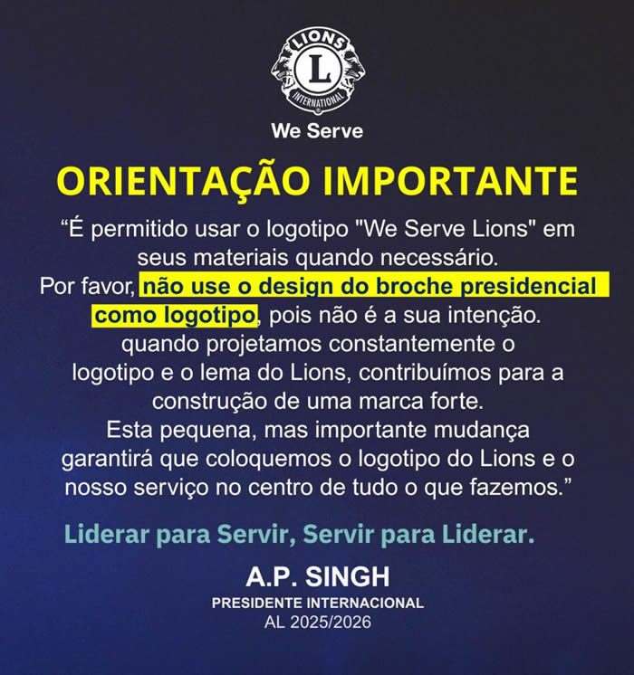 Ao iniciarmos um novo e poderoso ano Leonístico sob a liderança do Presidente Internacional A.P. Singh, é importante que todos entendamos e respeitemos as diretrizes relativas ao uso do Distintivo Presidencial oficial do Lions.